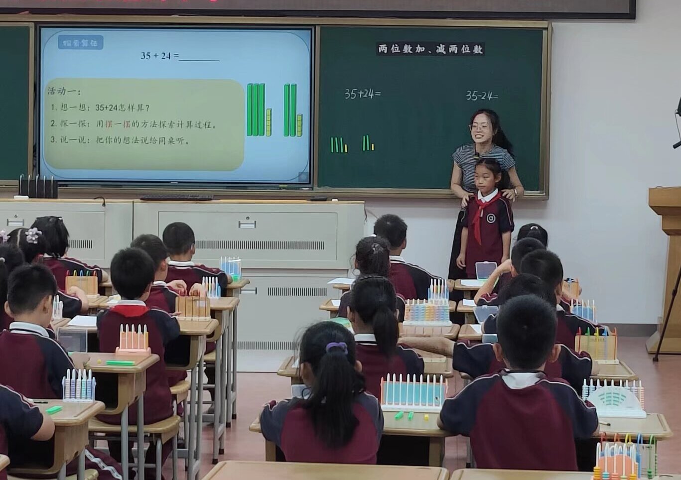 考察活动以课堂观摩为起点,一行人首先走进游文小学二年级数学课堂,聆听了一节主题为“两位数加减两位数”的示范课。课堂上,授课教师摒弃传统灌输式教学,巧妙运用画图直观演示、学具动手操作等方式,将抽象的数学算理转化为具象的探索过程。学生在动手摆一摆、画一画的互动中,主动发现计算规律、理解算理本质,充分展现了“以生为本”的课堂理念。听课的老师们认真记录、实时思考,对授课教师精准的学情把握、灵动的教学设计给予高度认可,也为自身后续优化课堂教学提供了鲜活参考。